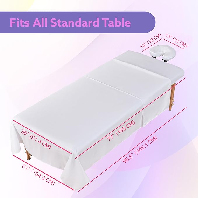 - UNIVERSAL FIT FOR STANDARD TABLES – Our massage sheet set fits all professional massage tables and spa beds & tables. The flat sheet for massage table measures 61" x 96.5”, the face cradle cover is 13" x 13" x 5”, and the fitted sheet for massage table is 36" x 77" x 7", ensuring a snug fit.