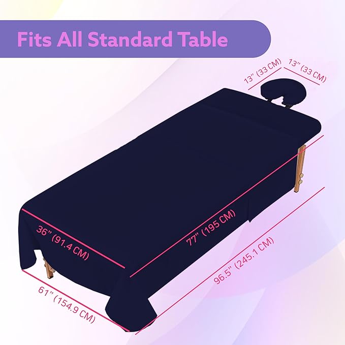 - UNIVERSAL FIT FOR STANDARD TABLES – Our massage sheet set fits all professional massage tables and spa beds & tables. The flat sheet for massage table measures 61" x 96.5”, the face cradle cover is 13" x 13" x 5”, and the fitted sheet for massage table is 36" x 77" x 7", ensuring a snug fit.