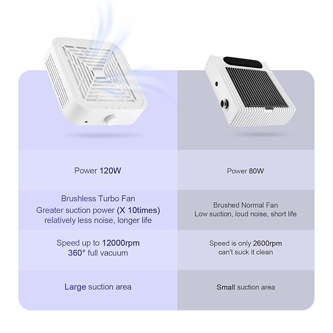 - Professional Dust Collector for Nails Salon: The brushless nail dust cleaner is 120W power, which is very powerful type in the marketplace. Out factory keeps innovating and improving the quality as time goes. Its high-quality motor ensures powerful suction and safe to work. Perhaps the noise is a little loud when working, but its main purpose is to let your customers and you away from dust. Great solution to your nail art work