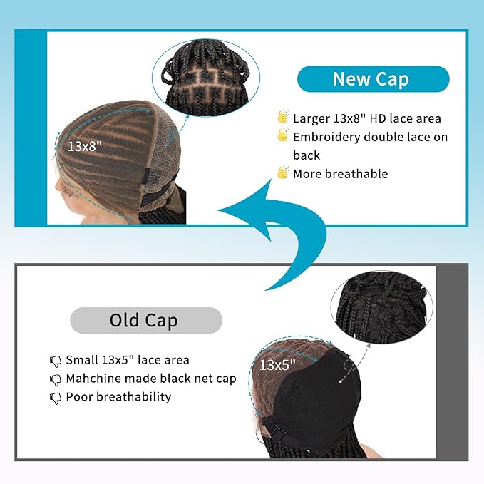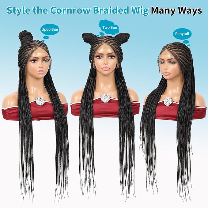 - [Premium Material] Our cornrow box braid wigs are using premium quality Japan-made fibers with a soft texture and a natural luster that is very close to human hair. The braids wig cap is made of 13x8 inch HD lace and back embroidery double lace. All wig braids are fully hand-tied, neatly and tightly, with no shedding and no tangled. In just ten minutes, you'll be able to get hours of salon like results. You can wear this braid lace wig for important occasions without any worries