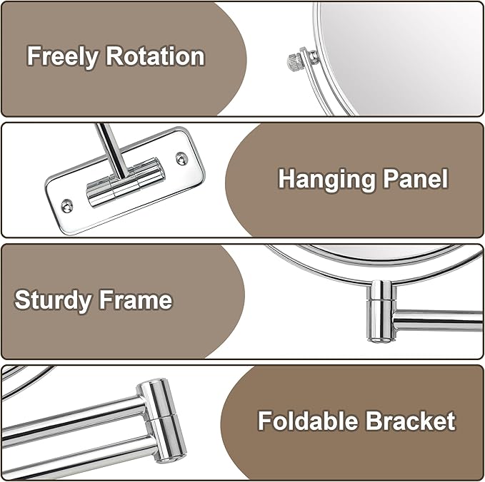 - 【Adjustable&Extendable Swing arm】- The wall mirror's arm is flexible, allowing you to adjust it at various angles and extend or fold it as needed. This offers immense convenience and also helps save space on your wall. And it can smoothly rotate 360 degrees within its frame, letting you find the most comfortable viewing angle.