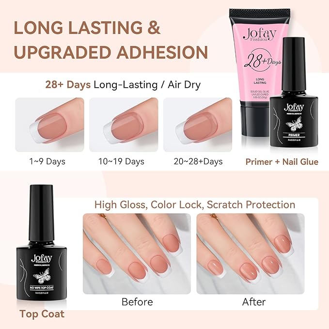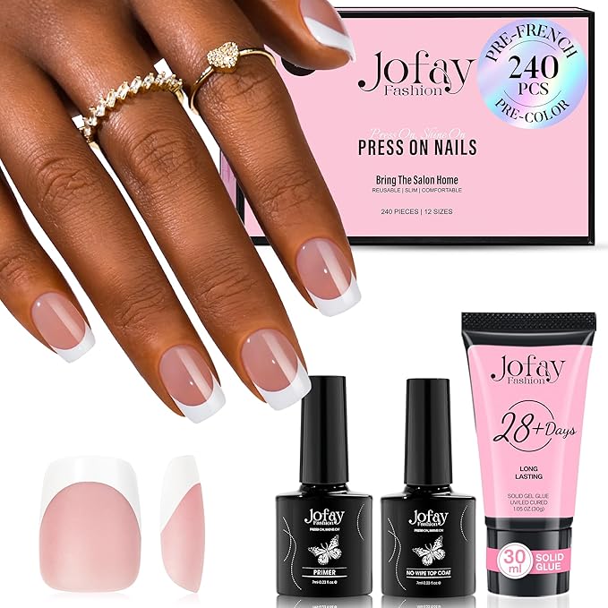 - 【PATENTED 3-IN-1 NEUTRAL NAIL TIPS WITH TIP PRIMER & BASE COAT】: Jofay Fashions' French tip press-on nails feature a patented technology where the x-coat tips come pre-applied with a tip primer cover and a base coat cover. This unique design creates a coarser matte surface on the nail tips, effectively removing nail grease in advance. As a result, the nails achieve stronger adhesion with glue and are less prone to falling off.