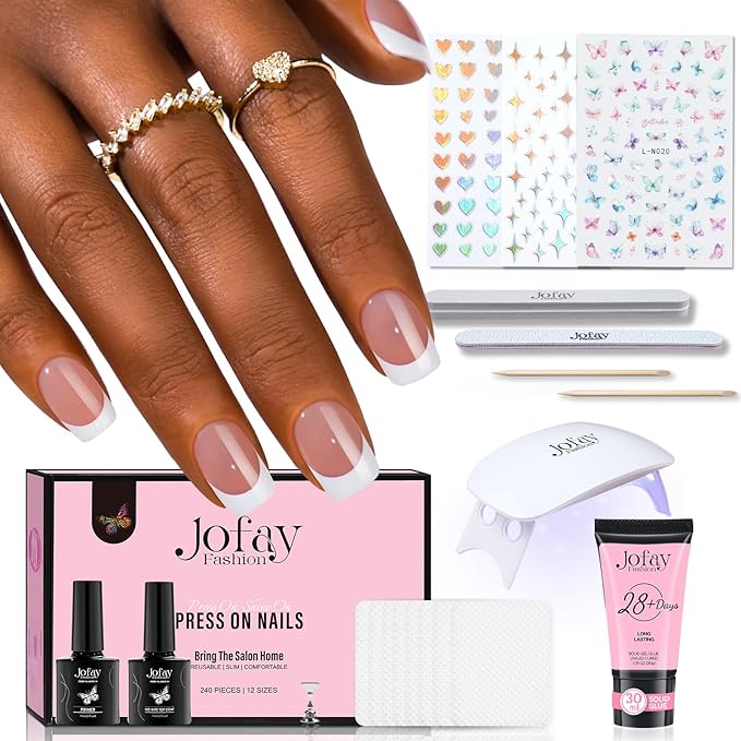 - 【UPGRADED NAIL TIPS & SOFT GEL NAIL TIPS】: Our package includes 240 pieces of extra-short square French nail tips, 10pcs pre-pad, 1* 7ml nail glue, 1* 7ml top coat, 1* 7ml nail primer, 1 *UV lamp, 3* love / Butterfly / Stars nail stickers, 1* nail stand, 1* nail file, 1* nail buffer, 1* manual, 2* wood cuticle pushers. With these, you can effortlessly extend your French fake nails and indulge in the joy of DIY manicures.