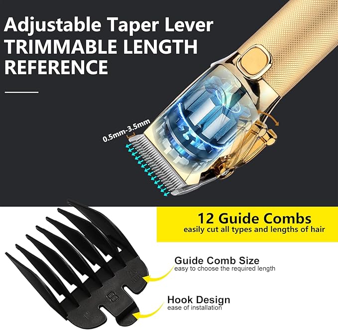 - Full-Size Professional Hair Clippers : The adjustable taper lever(0.5-3.5 mm)of the hair clippers works with the 12 guide combs(1.5-25 mm) to allow custom cutting lengths to meet the trimming needs of different lengths of hair which; achieve smooth hair trimming, can help you cut a clean and neat fade; designed to create seamless blends while hard or soft line fading, for thick and wet hair, no pulling, no sticking, and a more comfortable cutting experience
