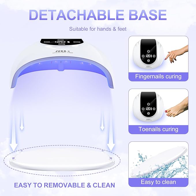 - Detachable Base Design: INFILILA UV lamp for nails has unique properties, is fast, is very energy efficient, and has a durable construction that won't black your hands. The base with a detachable makes the nail UV light easier to clean, and it can also cure the toenails, giving you a brand new salon nail experience