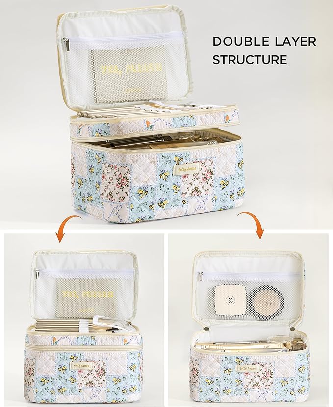 HBselect 2Pcs Travel Makeup Bag, Large Cotton Quilted Makeup Bag Cosmetic Bag Cute Make up Bag Toiletry Bags for Women Girls