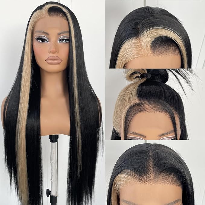13x6 Glueless Skunk Stripe Straight Wig Black And White Highlight Lace Front Wig Pre-Plucked Yaki Synthetic Grey HD Lace Front Wig 32inch
