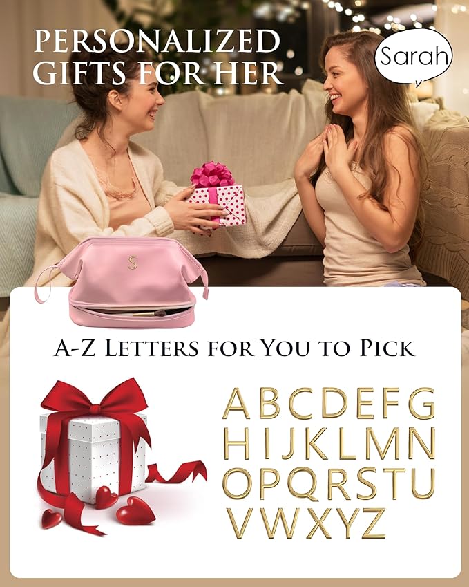 Mothers Gifts for Her, Initial Large Makeup Bag, Personalized Double Layer Cosmetic Bag with Makeup Brush Organizer, Birthday Gift Bag for Women/Girl, Personalized Teacher Gifts