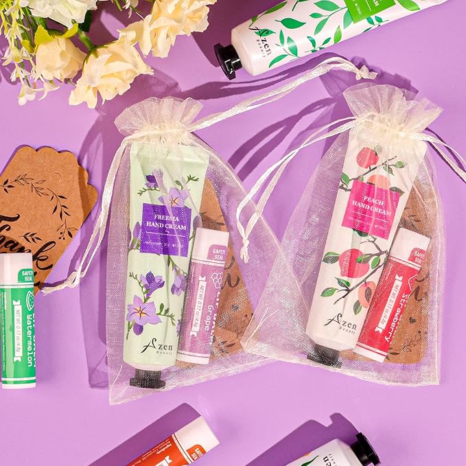 - Sufficient Coworker Gifts: This set includes 30 hand creams, 30 lip balms, 30 white organza bags and 30 thank-you labels. These are enough to share with family and friends during the wedding, and they are a good combination to meet your gift-giving needs