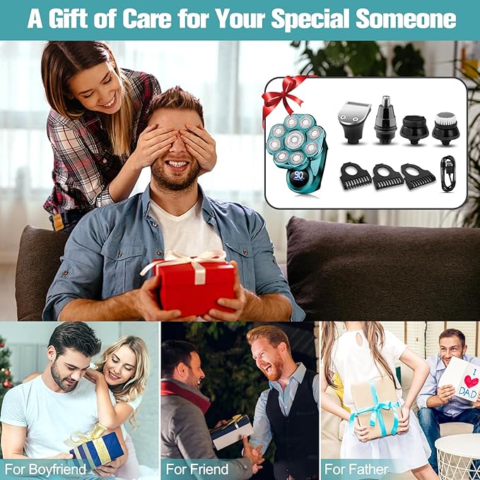 - 【5-in-1 Grooming Kit】Electric shavers for men includes 6 detachable Accessories, Head/Beard Shaver, Nose/Ear Hair Trimmer, Hair Trimmer(3/5/7mm), Facial Massage Brush, Facial Cleaning Brush, Body Trimmer. Professional 6 in 1 Multifunctional electric shavers, Different types of head razor shaver accessories meet all your personal facial shaving needs for beard and hair. Great for husband, partner, father, friends and brothers.