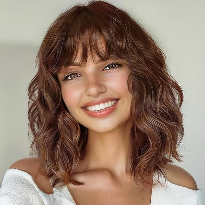 AISI HAIR Synthetic Wavy Curly Bob Wig with Bangs Brown Highlight Short Hair for Women Synthetic Heat Resistant Bob Wigs