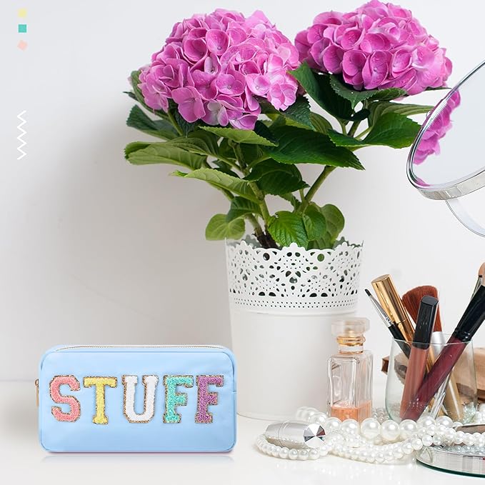 - Abundant Set Package: experience usefulness and style nicely with our abundant 2 pieces set accommodating your needs; This package includes a [TRAVEL] chenille letter preppy duffle bag and a [STUFF] chenille letter makeup organizer pouch; Both made from durable and visually appealing materials, designed to last while maintaining a fashionable appearance even with constant usage