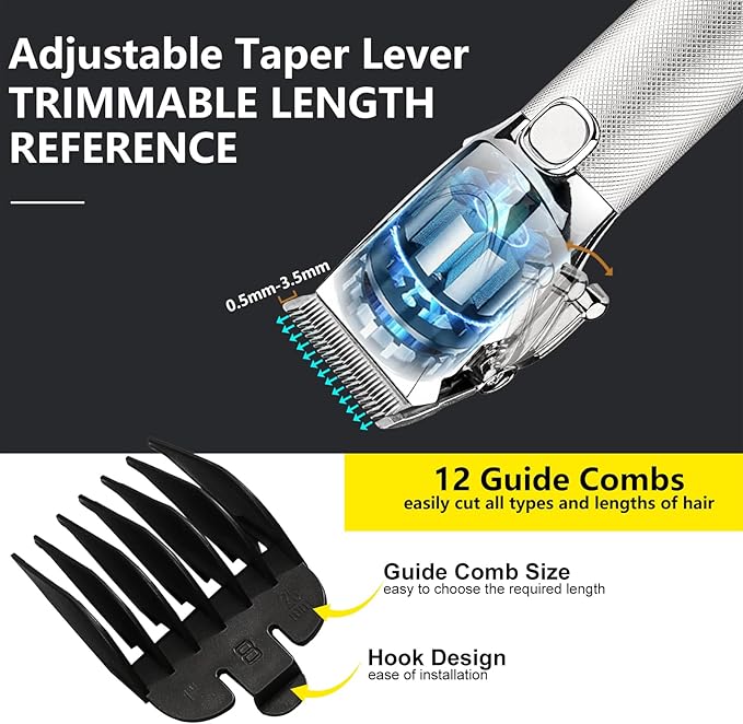 - Full-Size Professional Hair Clippers : The adjustable taper lever(0.5-3.5 mm)of the hair clippers works with the 12 guide combs(1.5-25 mm)to allow custom cutting lengths to meet the trimming needs of different lengths of hair which; achieve smooth hair trimming, can help you cut a clean and neat fade; designed to create seamless blends while hard or soft line fading, for thick and wet hair, no pulling, no sticking, and a more comfortable cutting experience