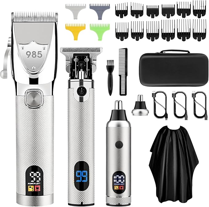Professional Hair Clippers for Men, Electric Cordless Clippers and Trimmers Set, Nose Hair Beard Trimmer, Hair Cutting Barber Clippers with Guards, T Liners Edgers Clippers for Mens (Silver)