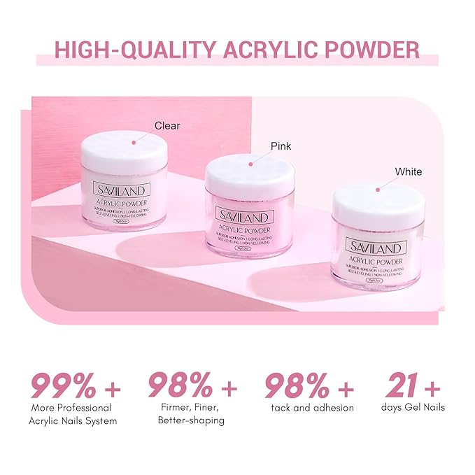 - ACRYLIC NAIL POWDER & GEL NAIL POLISH: SAVILAND 3pcs clear, white and pink acrylic powder, use with 3pcs acrylic brushes and acrylic liquid can create the strong hardness layer on your nail surface in a few minutes to fix and protect your nails. 3pcs white, pink, nudes gel nail polish have excellent self-leveling and high saturation, easy to apply and color, 3 basic powder can mix other color gel polish or nail glitter sequins to decorate your nail art.