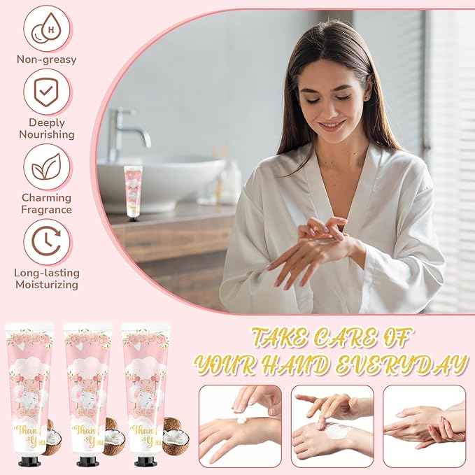 - Baby Shower Favors Hand Cream Sets: the package includes 24 hand creams, 24 thank you cards, and 24 organza bags; Our hand creams feature 3 delightful scents, namely Shea, coconut, and lemon; The fragrances add another layer of sensory delight to the hand cream, making each application an exciting and refreshing skincare experience; The rich aroma derived from these creams leaves the hands smelling pleasant the whole day