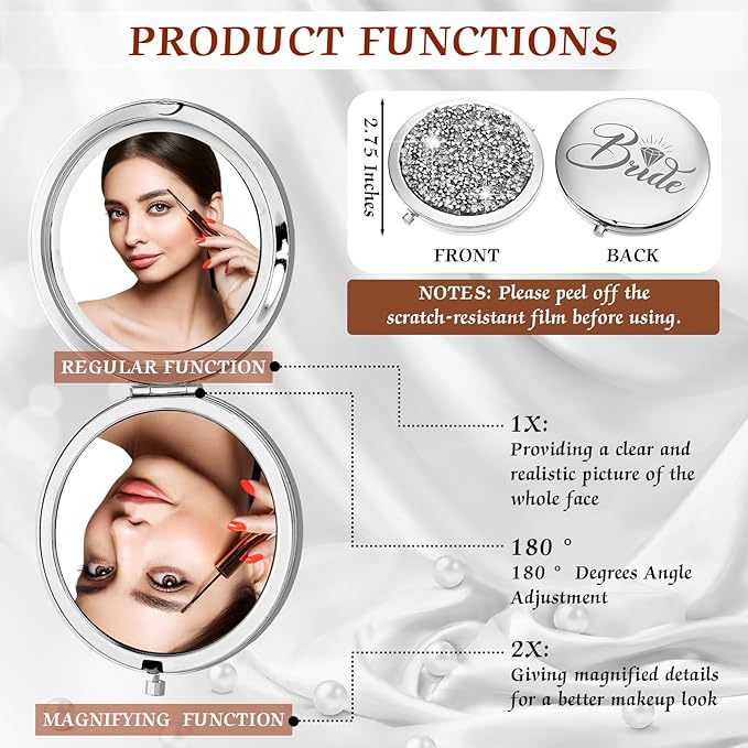 - Exquisite Styles: showcasing an exquisite style, the front of each compact mirror is inlaid with small, shining rhinestones, creating an elegant shine; Moreover, the back is engraved with [Bride] and [I Do Crew] words, adding attractiveness and charm to these beautiful accessories