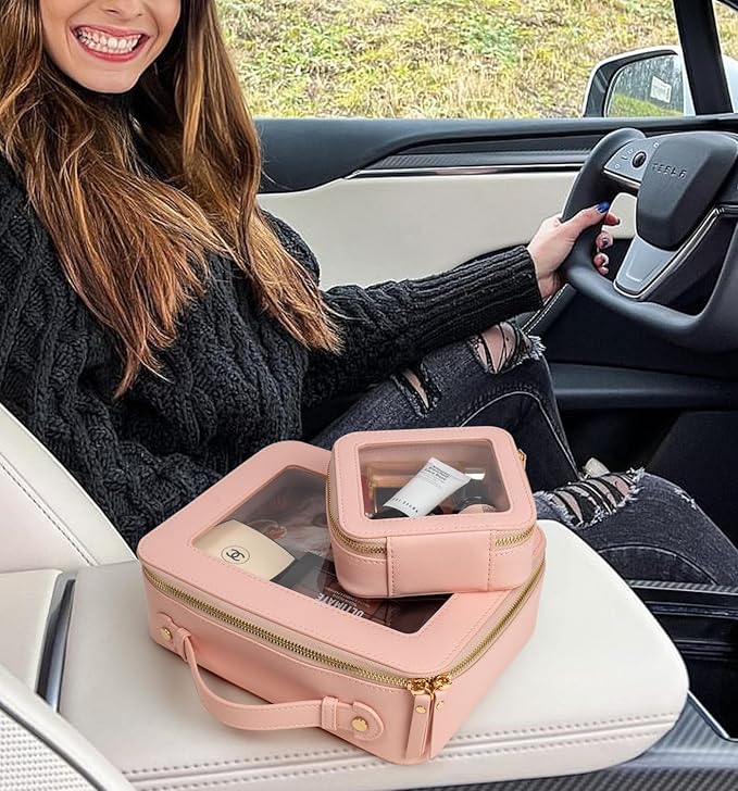 - ✈️CAR MUST HAVE ESSENTIALS CLEAR MAKEUP BAG : Large Size Measuring 9.84'' x 7.67'' x 3.14''(25cm x19.5cm x 8cm), Mini Size 5'' x 4.7'' x 2''(12.7cm x 12cm x 5cm), our clear makeup bag is elegant ,and stylish, this makeup travel organizer was designed in a minimalist boxy shape and Crafted in beautiful PU leather and finished with polished hardware, the trendy makeup bag is easy to carrying in your handbag or carry-on.