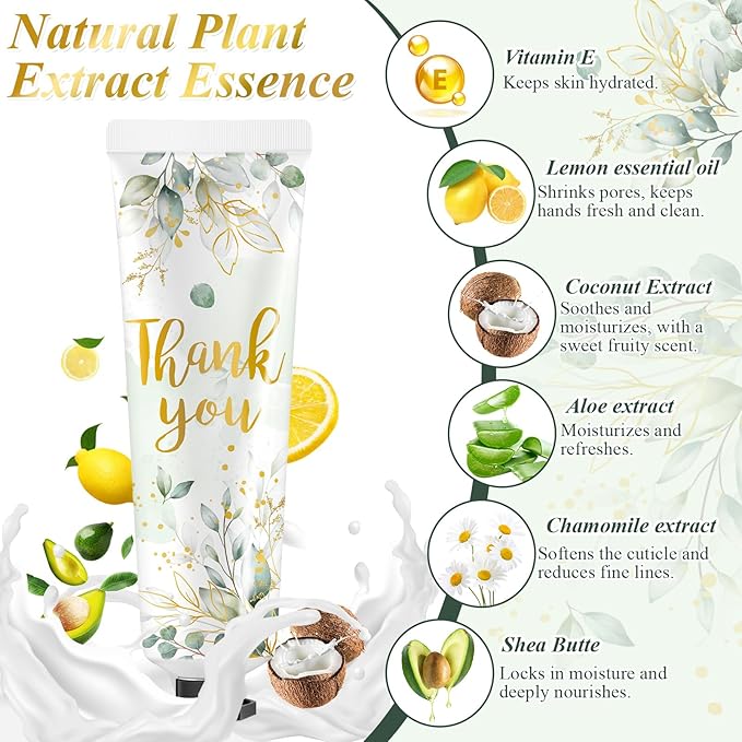 - Baby Shower Favors Hand Cream Sets: the package includes 24 hand creams, 24 thank you cards, and 24 organza bags; Our hand creams feature 3 delightful scents, namely Shea, coconut, and lemon; The fragrances add another layer of sensory delight to the hand cream, making each application an exciting and refreshing skincare experience; The rich aroma derived from these creams leaves the hands smelling pleasant the whole day