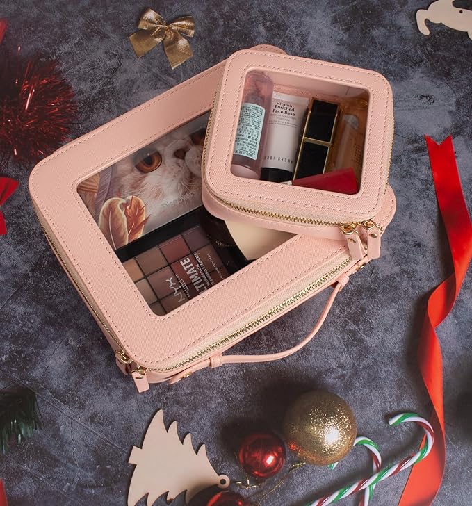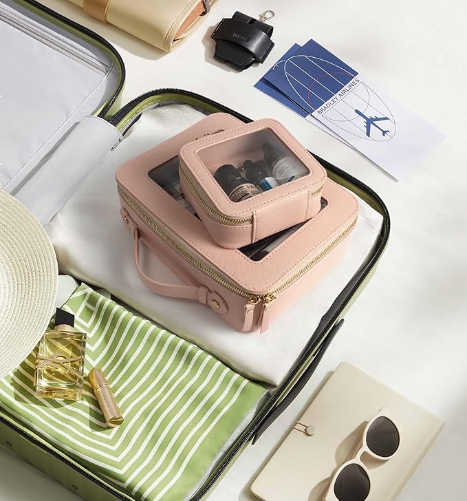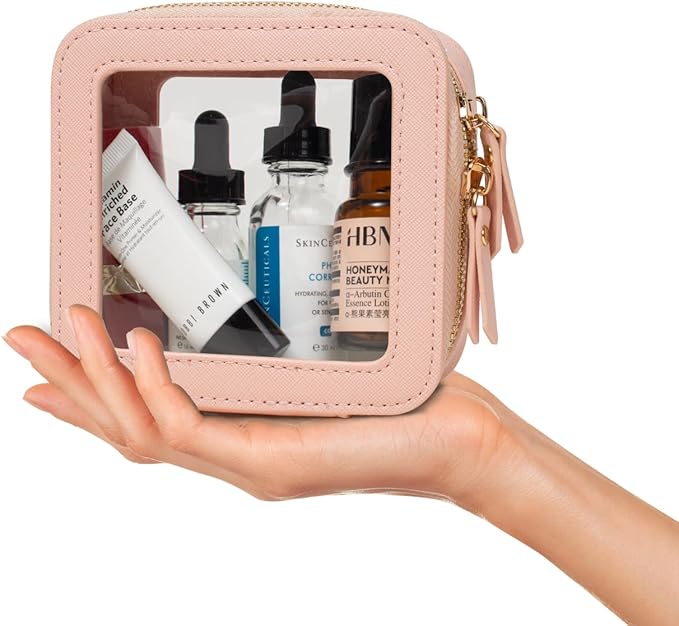 - ✈️CAR MUST HAVE ESSENTIALS CLEAR MAKEUP BAG : Large Size Measuring 9.84'' x 7.67'' x 3.14''(25cm x19.5cm x 8cm), Mini Size 5'' x 4.7'' x 2''(12.7cm x 12cm x 5cm), our clear makeup bag is elegant ,and stylish, this makeup travel organizer was designed in a minimalist boxy shape and Crafted in beautiful PU leather and finished with polished hardware, the trendy makeup bag is easy to carrying in your handbag or carry-on.