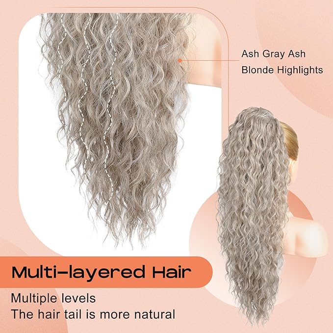 Blonde Ponytail Extension, SEIKEA 26" Lightweight Curly Drawstring Ponytail Long Thick Fake Pony Tail Multi Layered Natural Soft Clip in Hair Extensions Ponytail Ash Gray Ash Blonde Highlights
