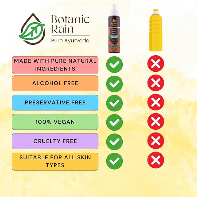 - NATURAL AND ORGANIC INGREDIENTS: Our ayurvedic body oil organic is made with all-natural and organic ingredients, which means it's gentle on your skin and free from harsh chemicals and synthetic fragrances. After shower body oil is suitable for use on all skin types, including sensitive skin. Organic body oil moisturizer is designed to nourish and hydrate your skin, leaving it feeling silky-smooth and radiant.