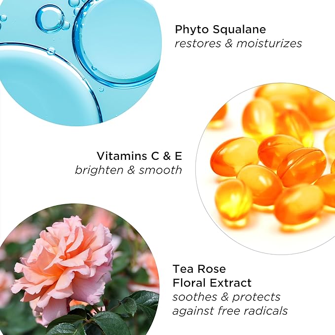 - INGREDIENT HIGHLIGHTS: Phyto Squalane to plump and moisturize, Vitamins C & E to visibly brighten and Tea Rose Floral Extract to protect skin.