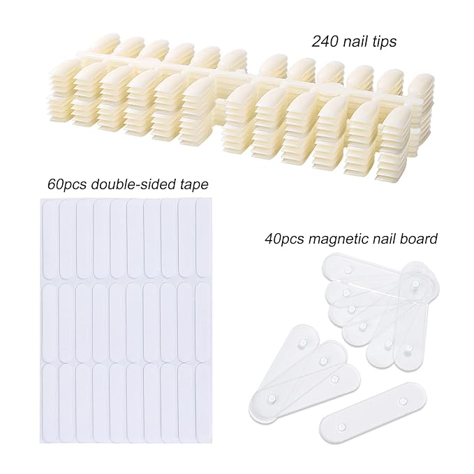 - Package include: 1X nail display book, 40X magnetic plate(which can play 6pcs nail tips ) ,240pcs nail tips, 60X double-sided adhesive