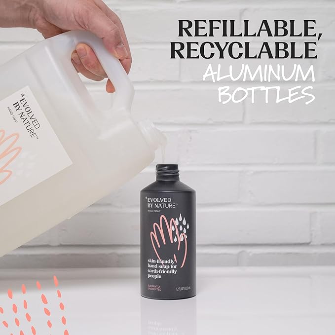 - MINIMIZES WASTE: Our soap dispensers are made of recyclable, reusable aluminum that can be refilled with our bulk hand soap that comes in recyclable 1 gallon (128 oz) jugs, filling 12 oz kitchen and bathroom soap dispensers 10 times