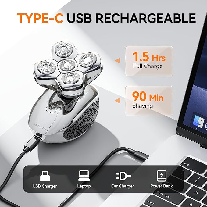 - 【360° Floating Shaver Head】MAXGROOM bald head shaver adopts 360° floating shaver head, closely following the contour of the scalp, face and neck to ensure a larger contact area and a close shaving every time; The high-speed powerful motor removes more hairs during each shave, delivering a faster and more efficient shaving experience.
