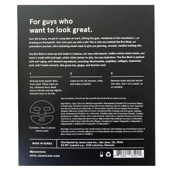 BRO MASK: Korean Face Mask for Men | 2 Pc. Hydrating Anti Aging Sheet Masks Contain Vitamin C, Vitamin E, Hyaluronic Acid, Hydrolyzed Collagen for Face Care, Acne Treatment (2 X 4 Packs)