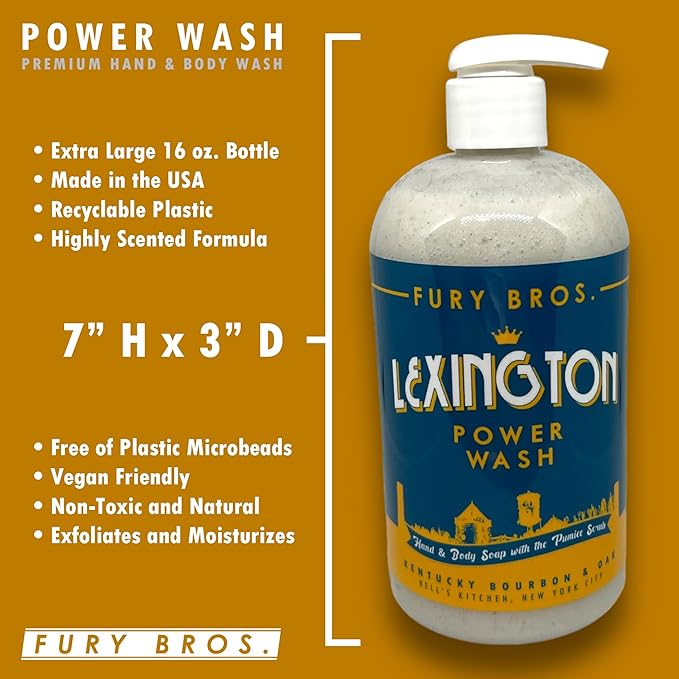 - BIG AND BOLD: Fury Bros. Power Wash comes in a hefty 16 oz. bottle, providing a generous amount of our rugged hand & body wash. Designed for the man who doesn't do anything small, this substantial size ensures you stay stocked up on your favorite premium wash. Plus, our plastic bottles are recyclable, making it easy to take care of the environment while taking care of yourself. Embrace a powerful clean with a product that's as tough and reliable as you are.
