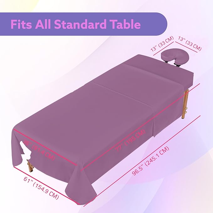 - UNIVERSAL FIT FOR STANDARD TABLES – Our massage sheet set fits all professional massage tables and spa beds & tables. The flat sheet for massage table measures 61" x 96.5”, the face cradle cover is 13" x 13" x 5”, and the fitted sheet for massage table is 36" x 77" x 7", ensuring a snug fit.