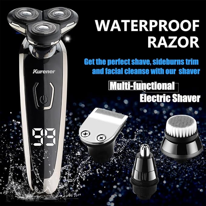 - 4-in-1 Multi-Functional Electric Razor: Designed for complete facial grooming, it includes attachments for beard trimming, sideburn shaping, facial cleansing, and nose hair trimming. Switching between heads is quick and easy, offering versatility in one sleek device.