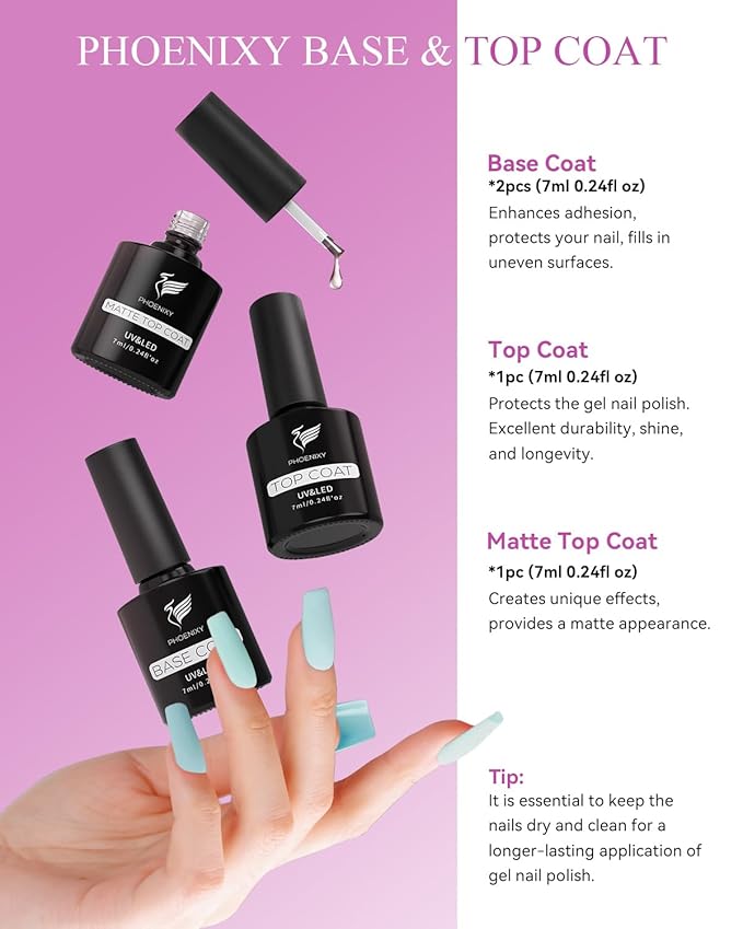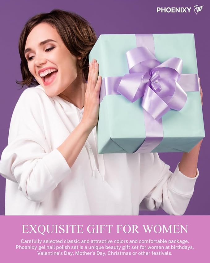- [High Quality & Long Lasting]: Made of natural resin, Phoenixy gel nail polish contains botanical ingredients and lowest smell, harmless to skins or nails. The higher quality promises better adhesion and gloss, smooth application, and strong color-locking ability. The nail polish can last more than 3 weeks with proper application (keep your nails clean with file and buffer before applying base coat).