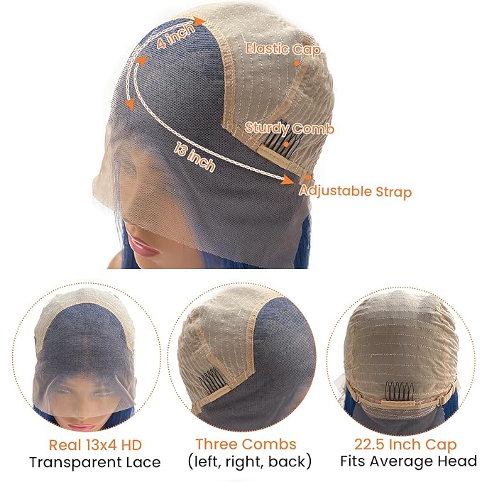 - Elastic Wig Cap with Combs & Straps: short blue lace front bob wig human hair, default cap wig size is 22.5 inch with 3 combs(1 on each side and 1 back) and adjustable straps, fits average head sizes, easy to install and no special skills needed