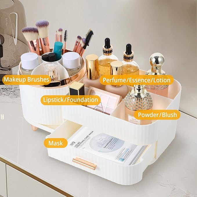 Makeup Organizer Countertop with Drawer 360 Rotating Brush Holder Storage Large Capacity Skincare Cosmetic Display Cases for Vanity Bathroom Desktop, Model 3016 White