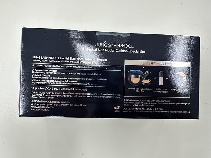 JUNGSAEMMOOL OFFICIAL Essential Skin Nuder Cushion Special Set (Medium) | Navy Edition (Refill included) + Lip-Pression Glittering Topper (2g) + Navy Cushion Puffs (3pcs)