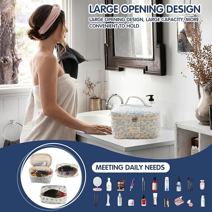 Quilted Floral Makeup Bag 3PCS, Cute Cotton Coquette Aesthetic Travel Toiletry Bag, Zipper Cosmetic Pouch, Daily Travel Use Skincare Bag, Large Capacity (Powder Blue Botanical)
