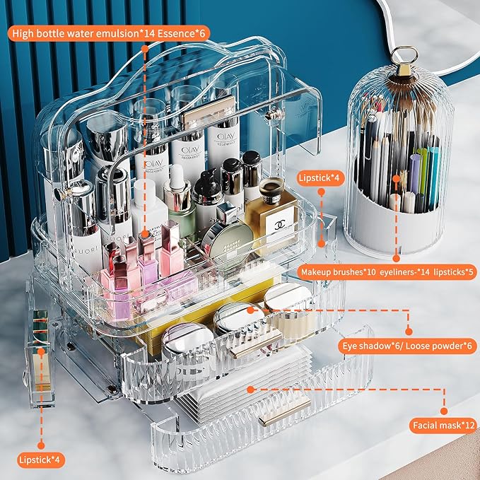 - Dust Proof, Easy to Carry:he crystal-clear cover keeps your cosmetics away from dust and water, keeping them tidy and clean.The two-way flip lid of this makeup cube organizer is more convenient to use everywhere.Bathroom organizer is equipped with a built-in clip to avoid tilting and falling when pulling out the drawer.Portable handle, you can carry it at any time. It would be a great travel helper.