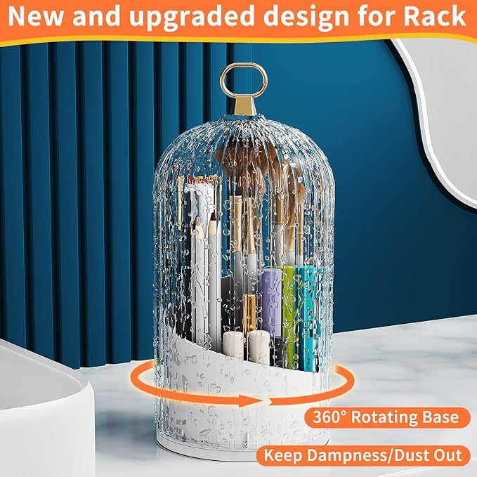 - 360 Rotating Dustproof Makeup Brushes: 360°rotatable base, switchable to your favorite angle for easy use and good-looking placement,The makeup brush organizer has enough space to hold your different brush sizes.clear cover, no dust will fall on your brushes and no makeup powder will fly around