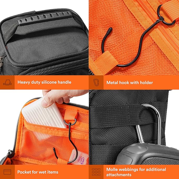 - CARRIES ALL YOUR TOILETRIES WITH 4 UNIQUE COMPARTMENTS - Store travel-size shampoo in the main compartment, keeping your dampened accessories separate in the front wet pocket. Ensure visibility and security by utilizing the inside mesh pocket for smaller items and the rear side pockets for everything else. This toiletry bag is the ultimate toiletry bag to help you stay groomed on the go.