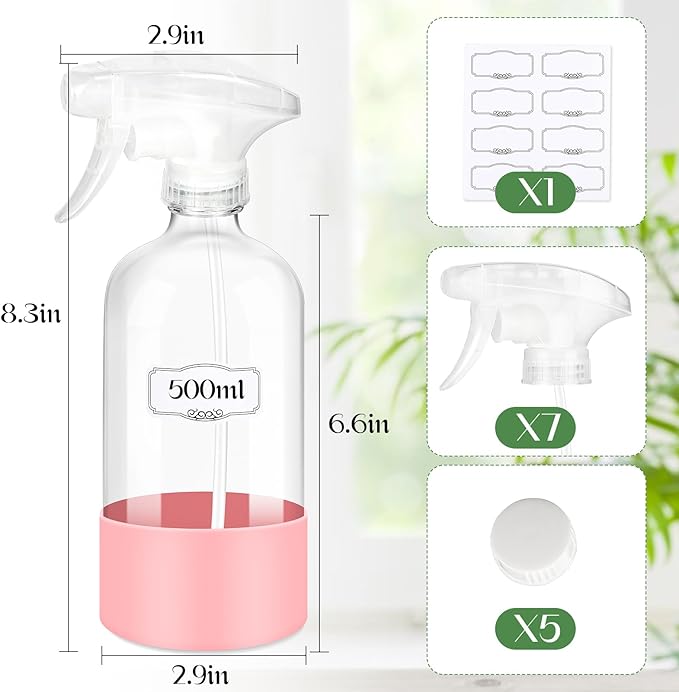 - Combo Containers Set: A complete package contains clear 16 oz bottles x 5, screw cone lids x 5, trigger nozzles x 7 and adhesive organizer labels x 8. You can place it on your livingroom or bathroom counter, sorting and labeling different liquid bottle at a glance.