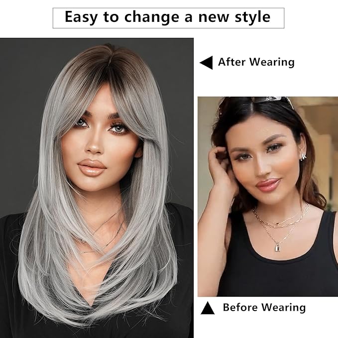 7JHH WIGS Grey Ombre Layered Wig with Curtain Bangs Long Straight Pixie Cut Natural Looking Heat Resistant Synthetic Hair Fiber Wigs for Women Daily Used