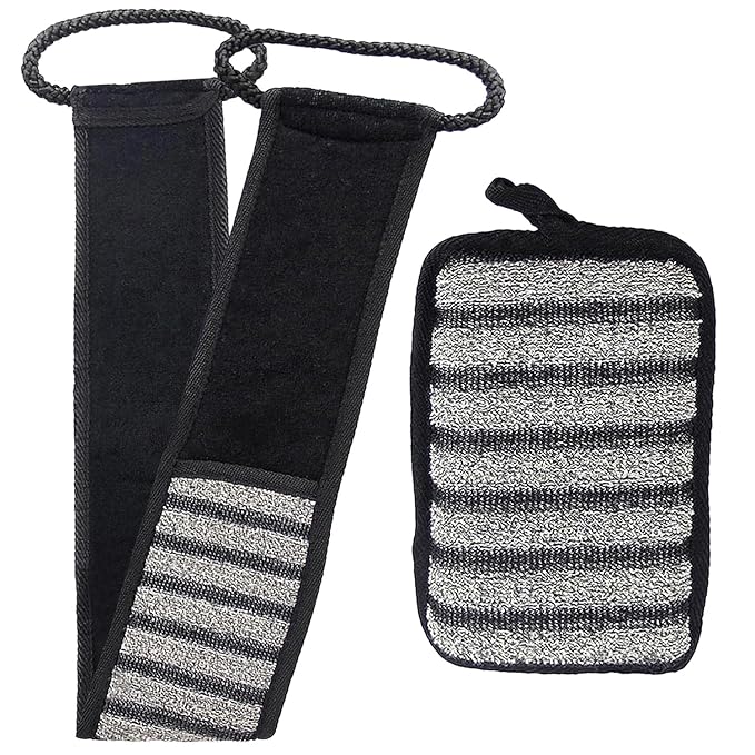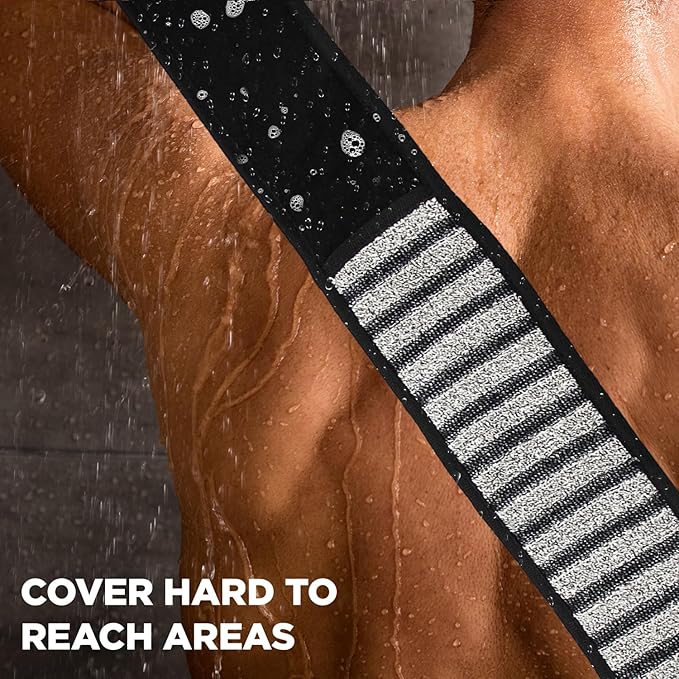 - Long Exfoliating Back Scrubber for Men is designed with easy - to - hold handles. It helps to clean those hard-to-reach areas on the back and helps brush skin impurities off. A Shower Sponge is a convenient way to clean other parts of the body with an exfoliator effect