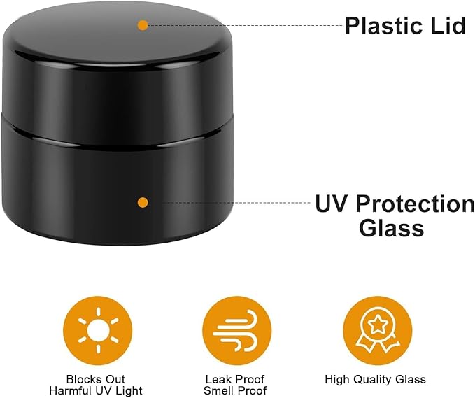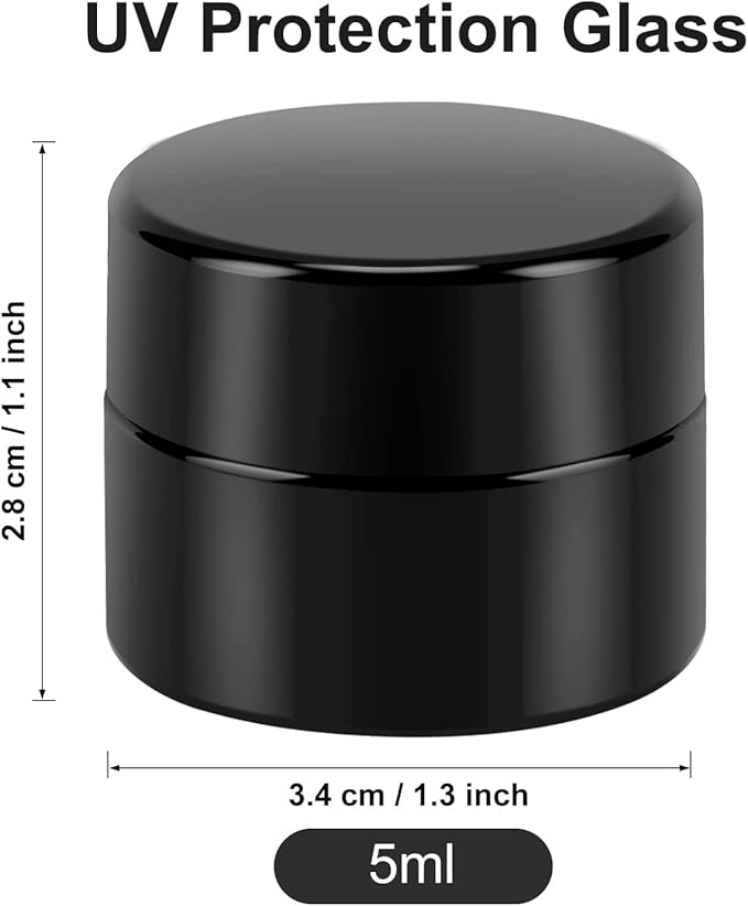 - 【Premium Quality】: These 5ml black UV protection glass jars are made from high-quality materials that are built to last. The thick-bottomed glass provides superior protection from damaging visible light, ensuring that your cosmetics stay fresh and effective for longer periods of time.