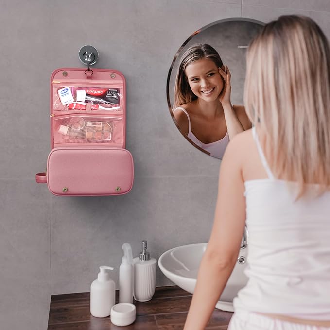 Leather Travel Toiletry Bag for Men with Removable Cover and Hanging Hook - Dopp Kit for men - Makeup Bag Organizer for Women for all your Travel Essentials (PINK)