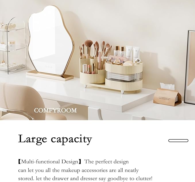 - Multi-functional Design: large cosmetic storage countertop is divided into two areas, the left side of the 360 rotating storage pen holder, the right side of the separation of 3 Layer cosmetic storage box, the perfect match can let you all the makeup accessories are all neatly stored. let the drawer and dresser say goodbye to clutter