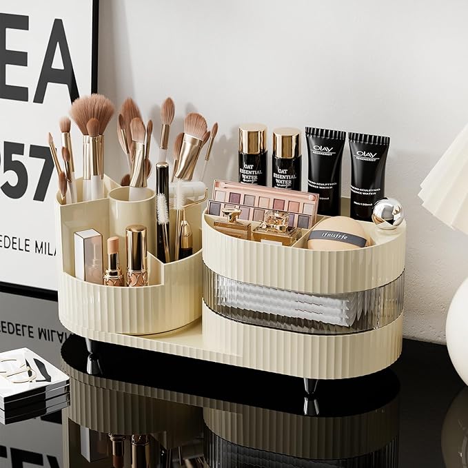 Ivory Rotating Vanity Organizer with Drawer & Brush Holder - 3 Layer Cosmetic Skincare & Perfume Storage - Countertop Makeup Display Case