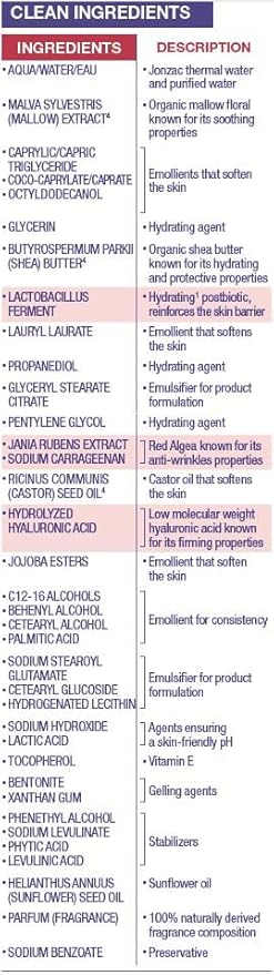 - Active Ingredients: Jonzac Thermal Spring Water, Postbiotics, LMW Hyaluronic Acid, Jojoba Esters and Red Algae Extract combine to hydrates, soothes, and supports skin health.